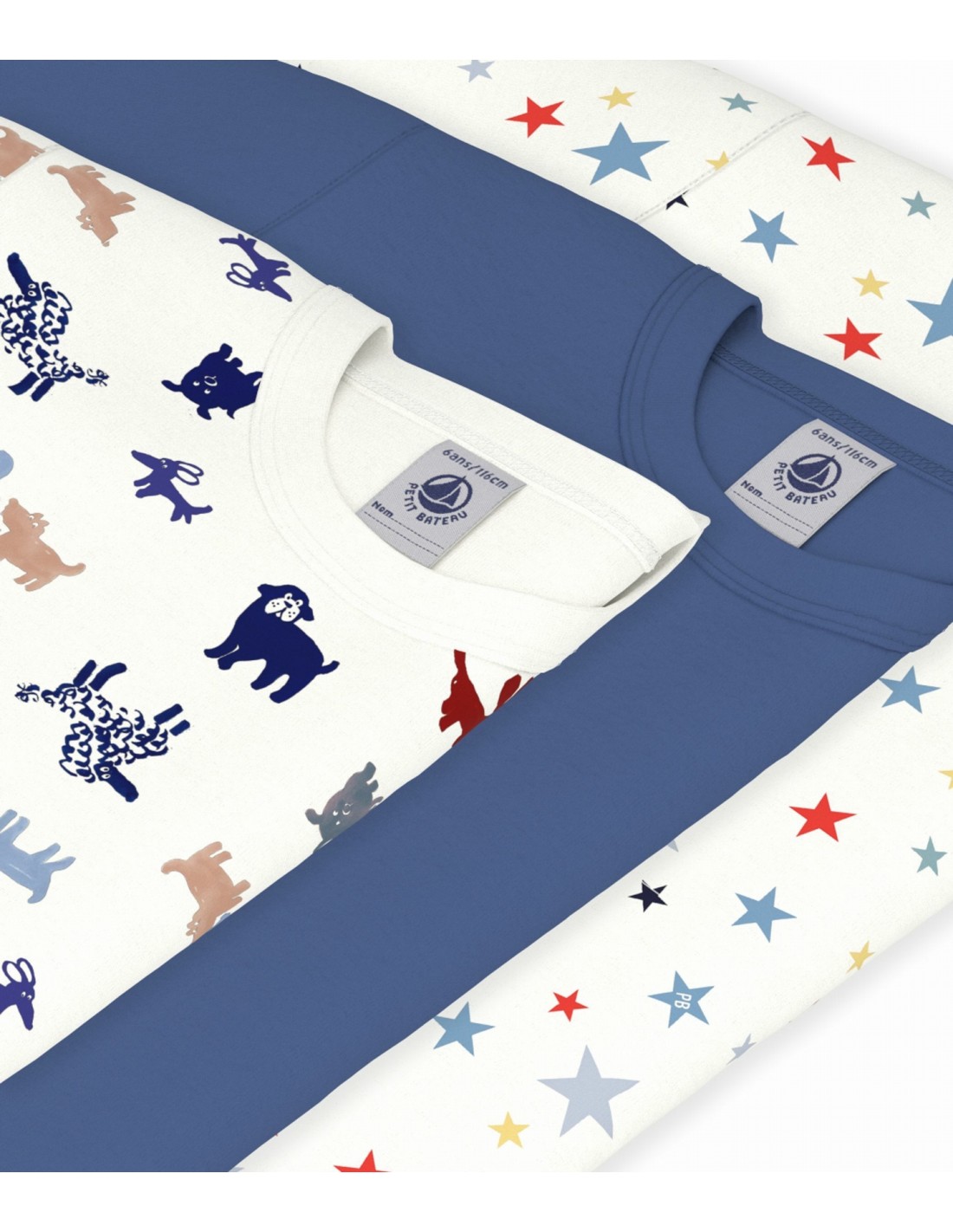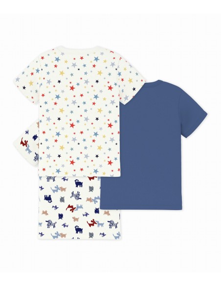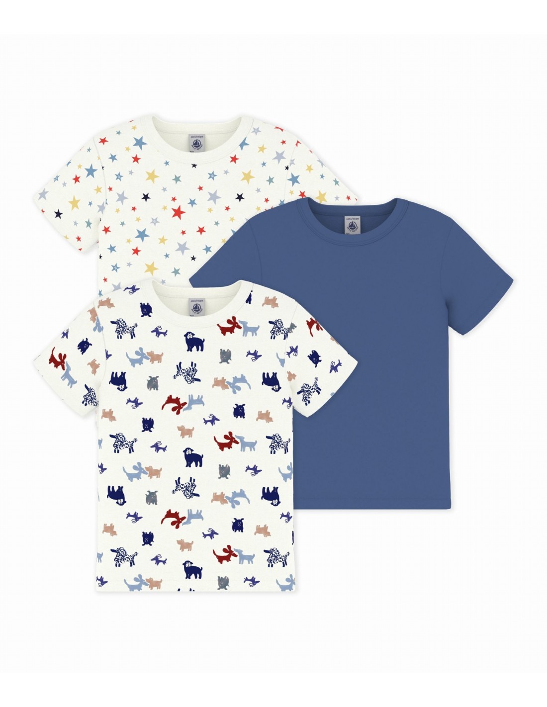 Ce lot comprend un tee-shirt en côte 1x1 unie, un tee-shirt en côte 1x1 imprimé chiens et un tee-shirt imprimé étoiles.
